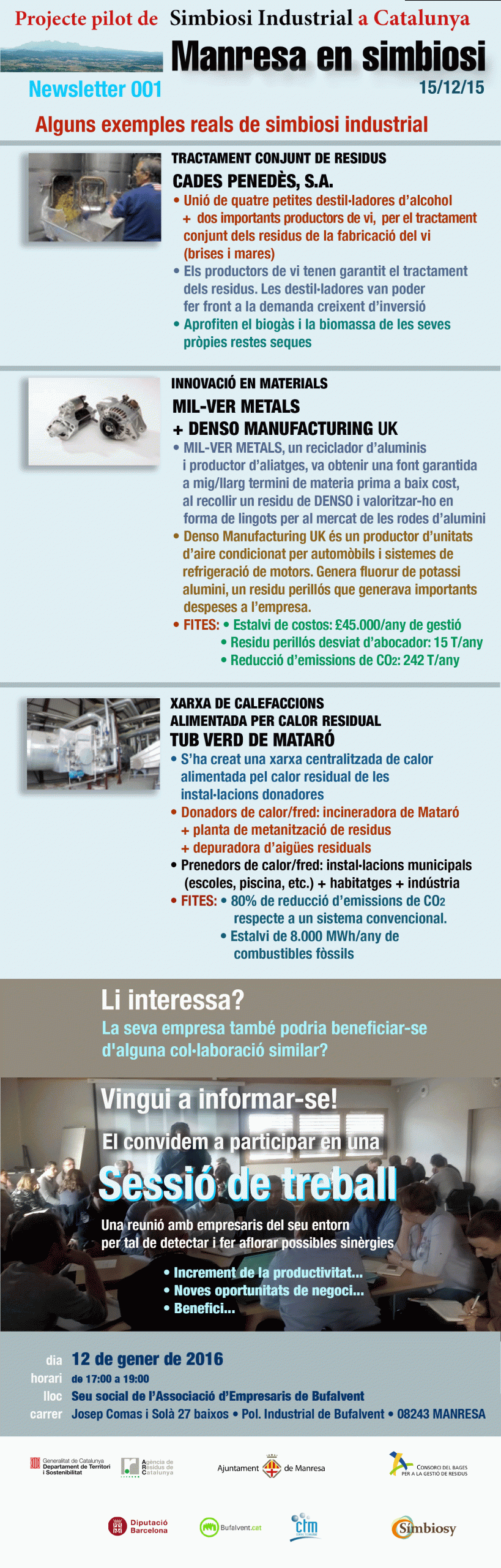 El projecte “Manresa en Simbiosi” es posa en marxa aquest 12 de gener amb la primera sessió de treball dels empresaris de Manresa per a la creació de sinergies industrials. Més de 20 empreses ja estan inscrites a aquest primer taller. Les inscripcions segueixen obertes a “simbiosy@simbiosy.com”