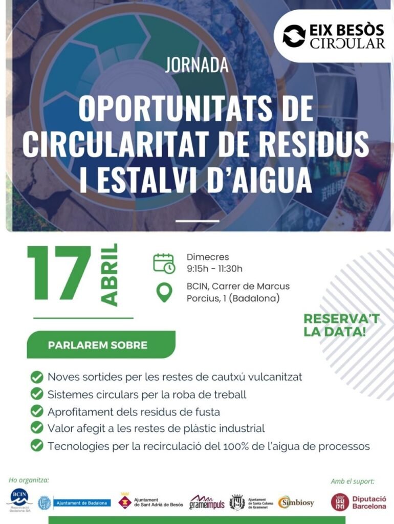 El próximo 17 de abril, en el marco del proyecto de simbiosis industrial Eix Besòs Circular se celebra la jornada empresarial Oportunidades de circularidad de residuos y ahorro de agua.
