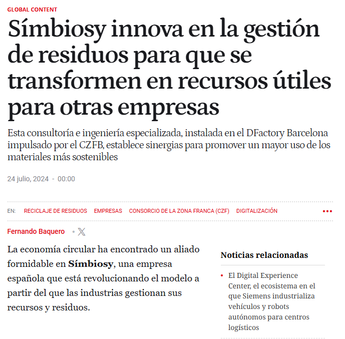 Crónica Global ha publicado un artículo destacando la labor de Símbiosy en el movimiento hacia la sostenibilidad. Este artículo ofrece una visión detallada sobre nuestra metodología, proyectos sistémicos e impacto en la economía circular y la simbiosis industrial.